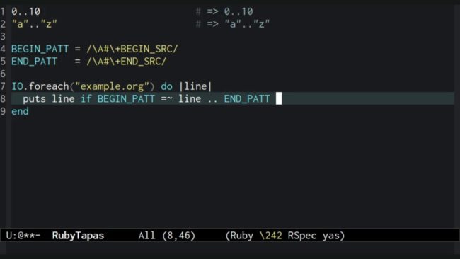 LanguagePremium EpisodesS3 Premium Episode #233: Flip-Flop Avdi Grimm August 28, 2014 0 Comments Continuing from the last episode's them of exploring the Range type, today we look at one of Ruby's more peculiar legacies from AWK and Perl. This page is just for members. Sign in or subscribe to gain access! Username Password Remember Me Forgot Password Related CategoriesLanguage, Premium Episodes, S3 PremiumTagsconditionals, perl